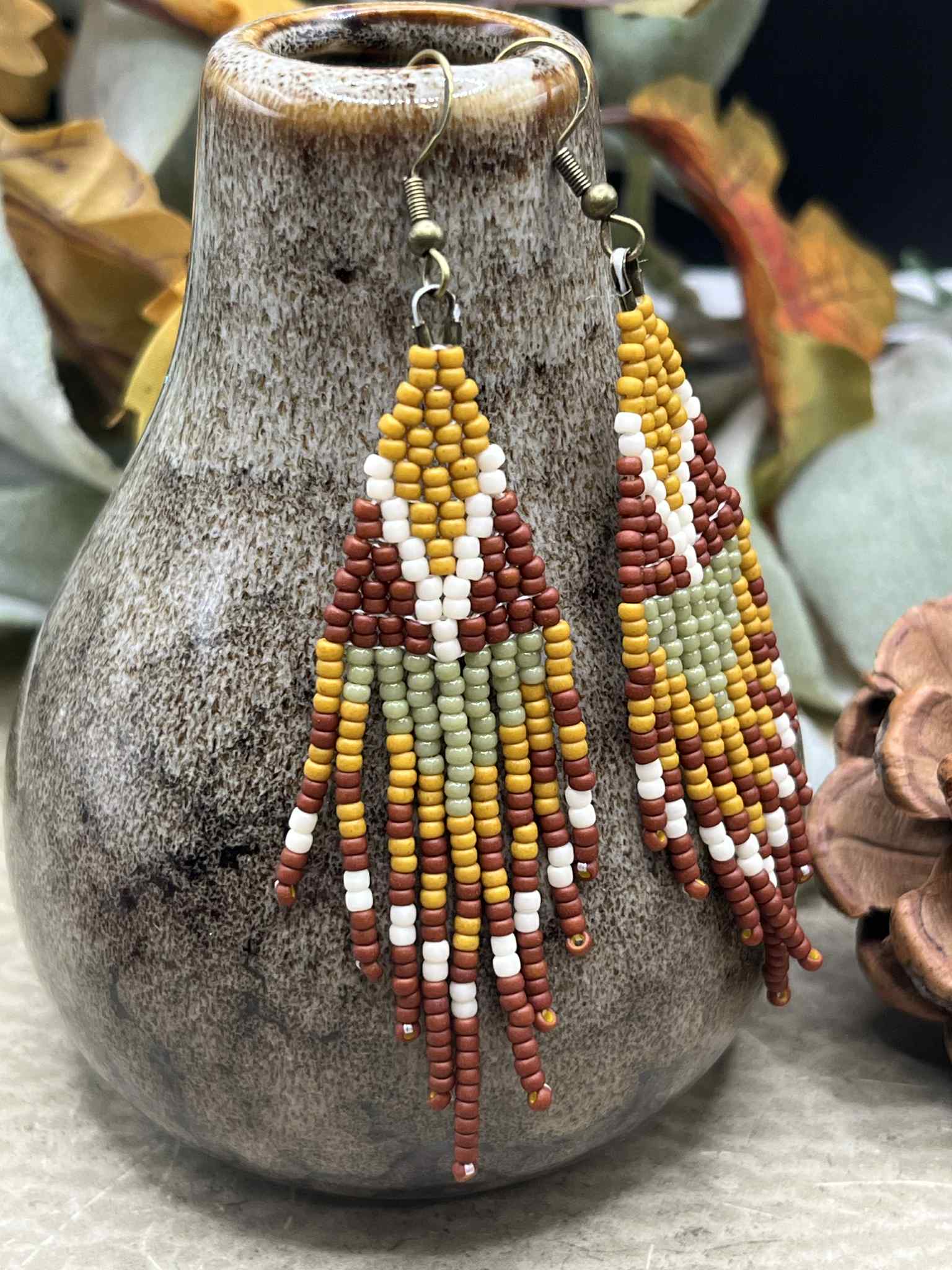 This pair of fringe earrings are about 2.5” of beautiful 11/0 Miyuki beads! This pallet of colors is actually perfect for the fall/winter season!