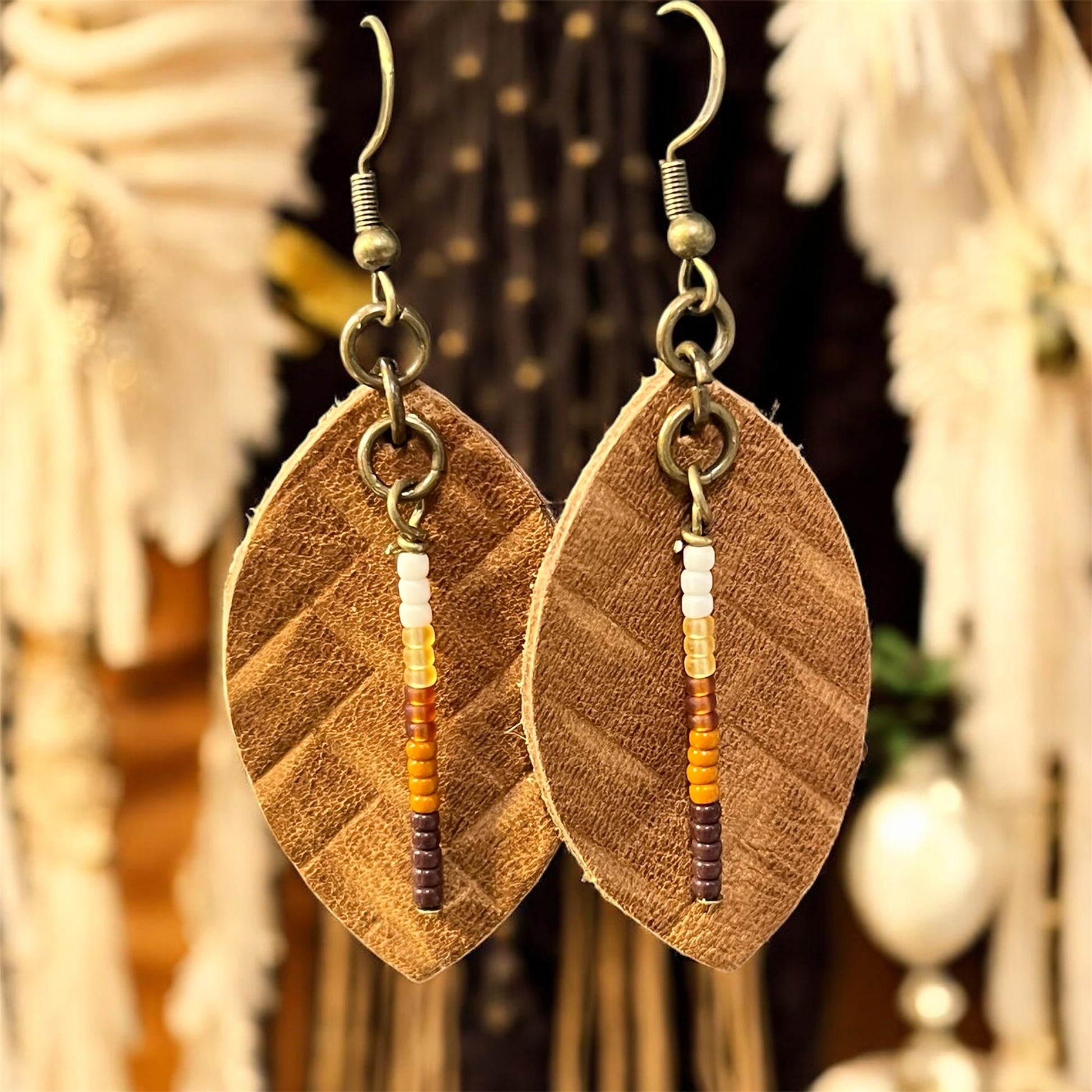Genuine leather with a beautiful strand of beads dropped in the center. They are about 1 3/4” long on stainless steel ear wires.